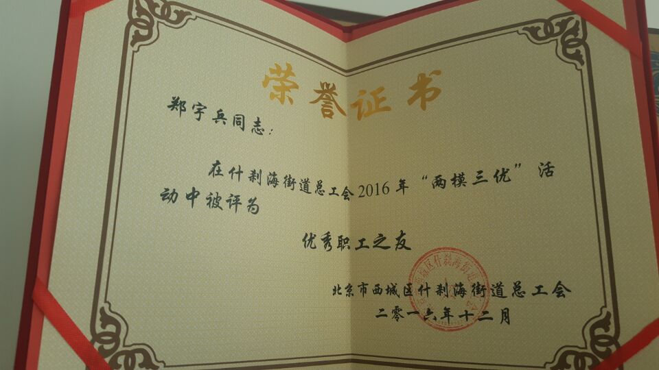 北京大陸航星質(zhì)量認(rèn)證中心股份有限公司總經(jīng)理鄭宇兵在什剎海街道總工會2016年“兩模三優(yōu)”活動中被評為優(yōu)秀職工之友。