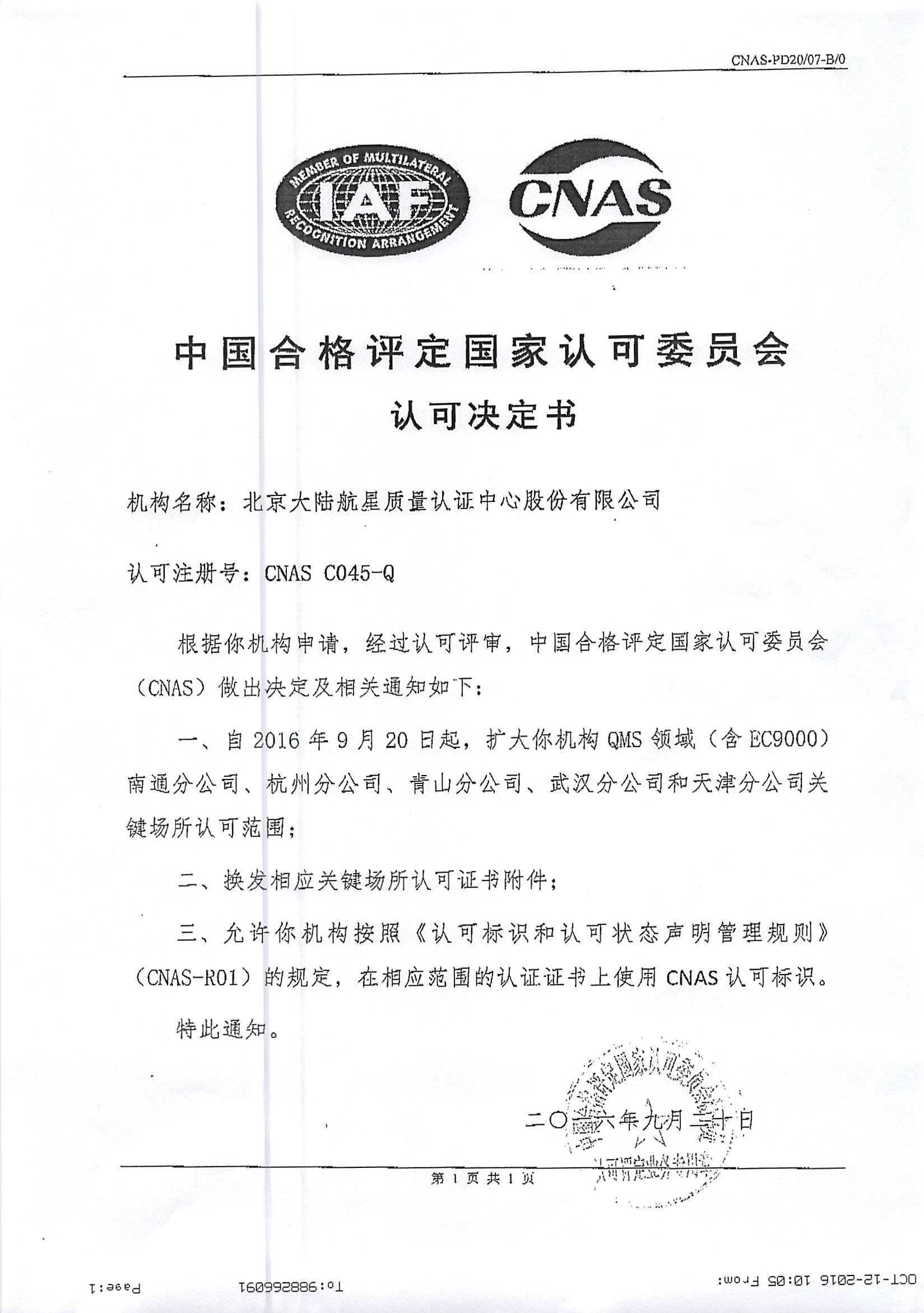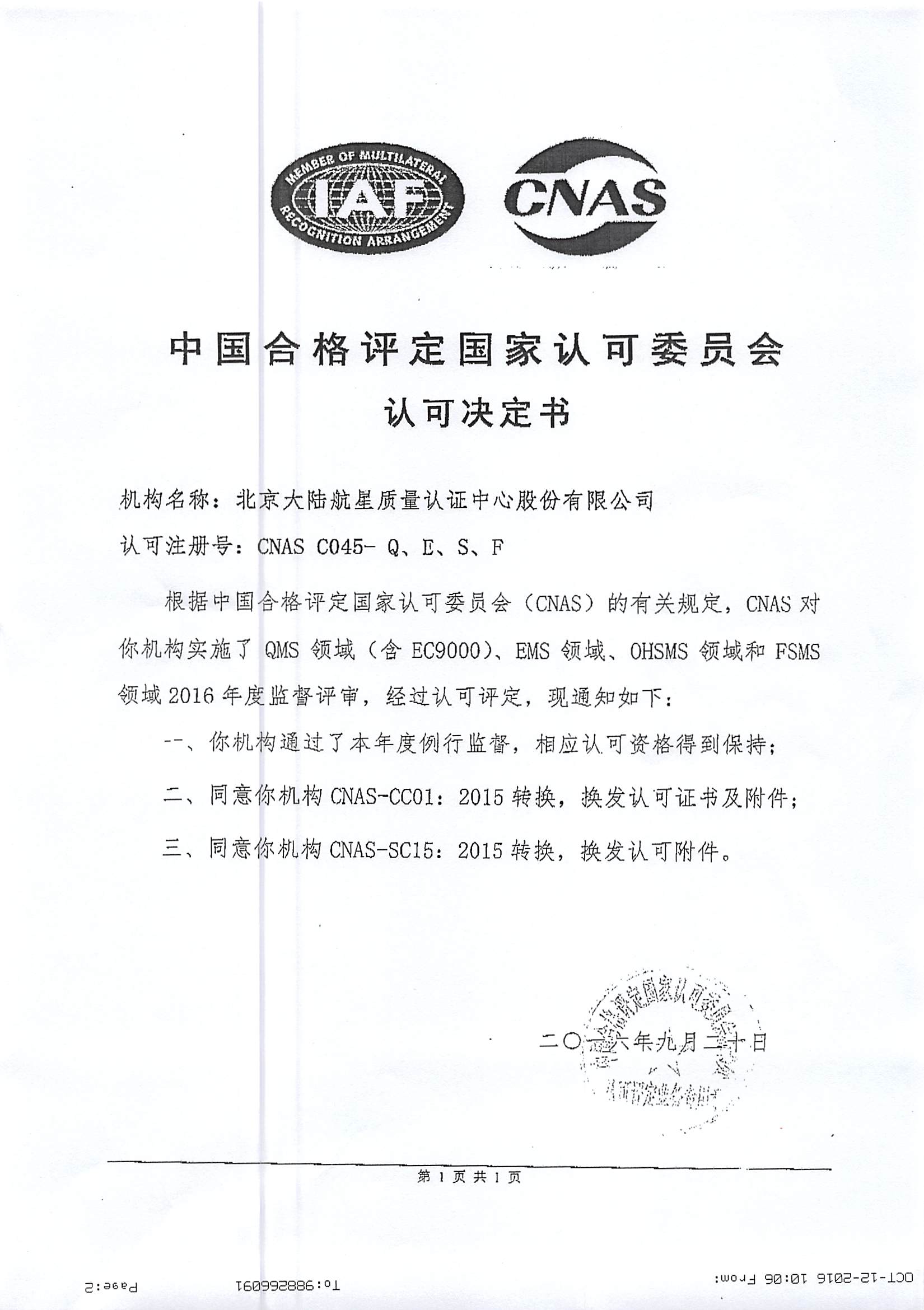 在管理層團隊的引領下,經總部各部門、各分支機構及相關人員的共同努力,北京大陸航星質量認證中心股份有限公司(以下簡稱HXQC),順利通過中國合格評定國家認可委員會(CNAS),對我公司進行的例行監督、轉換及擴大評審。保持了QMS(含EC9000)、EMS、OHSMS和FSMS認證領域的認可資格,并通過了CNAS-CC01:2015和CNAS-SC15:2015轉換評審,同時擴大了我公司QMS(含EC9000)認證領域南通分公司、杭州分公司、青山分公司、武漢分公司和天津分公司5個關鍵場所。