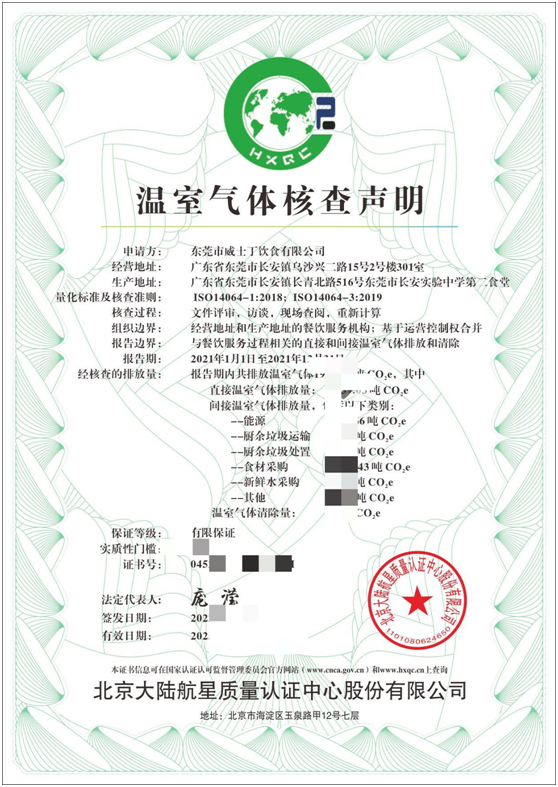 近日,北京大陸航星質量認證中心股份有限公司(以下簡稱HXQC)為東莞市威士丁飲食有限公司(以下簡稱威士丁)簽發溫室氣體核查聲明證書。這是HXQC為食品行業頒發的首張溫室氣體核查證書。